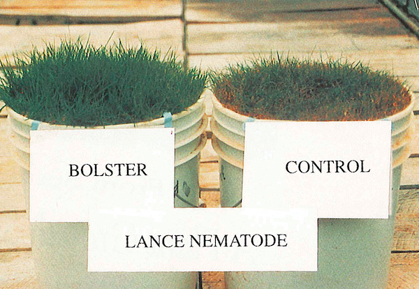 Bermudagrass was infected with Lance nematodes. BOLSTER was applied every two weeks during February to mid-May. Growth of the control is stunted and wilt stress at the edge of the container is becoming apparent.